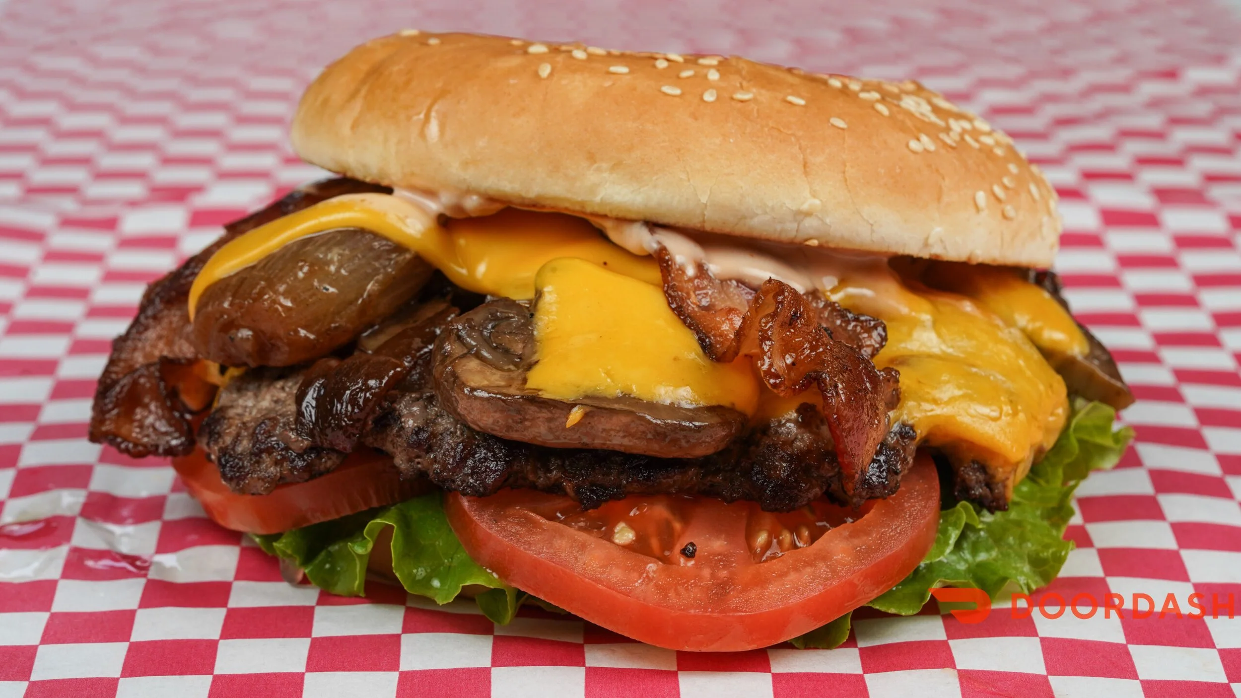 lettuce, tomato, sautéed mushrooms and onions under two slices american cheese, our sauce and bacon on a sesame seed bun